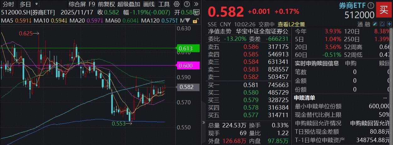 12月25日,券商板块看守小幅红盘颠簸,个股大批飘红,抑止发稿,东北证券涨超3%,财通证券、锦龙股份涨超1%。400亿顶流券商ETF(512000)场内价钱现微涨0.17%,沿着5日均线小碎步爬升。
